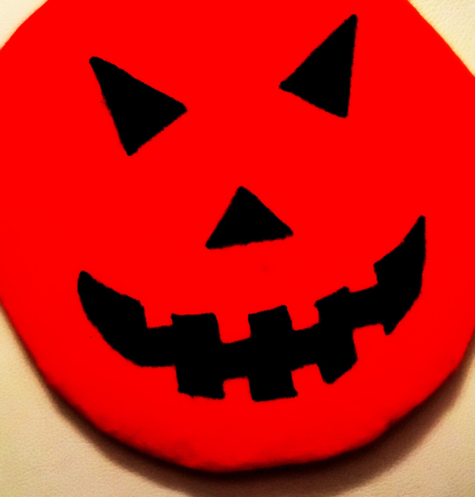 Reproduire le modèle de la citrouille sur la feutrine orange et coloriez les yeux, le nez et la bouche avec le marqueur noir ou le feutre à textile noir.